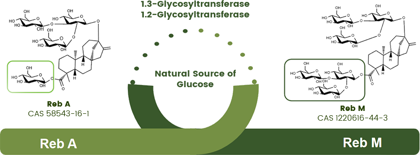 The bio-conversion method for producing Reb M uses Reb A, which is extracted from stevia leaves grown and harvested in traditional agricultural cycles. Alternatively, fermented Reb M is derived from non-stevia leaf raw materials. These materials are processed through precision fermentation to produce steviol glycosides, which are then further converted into Reb M through multiple steps.